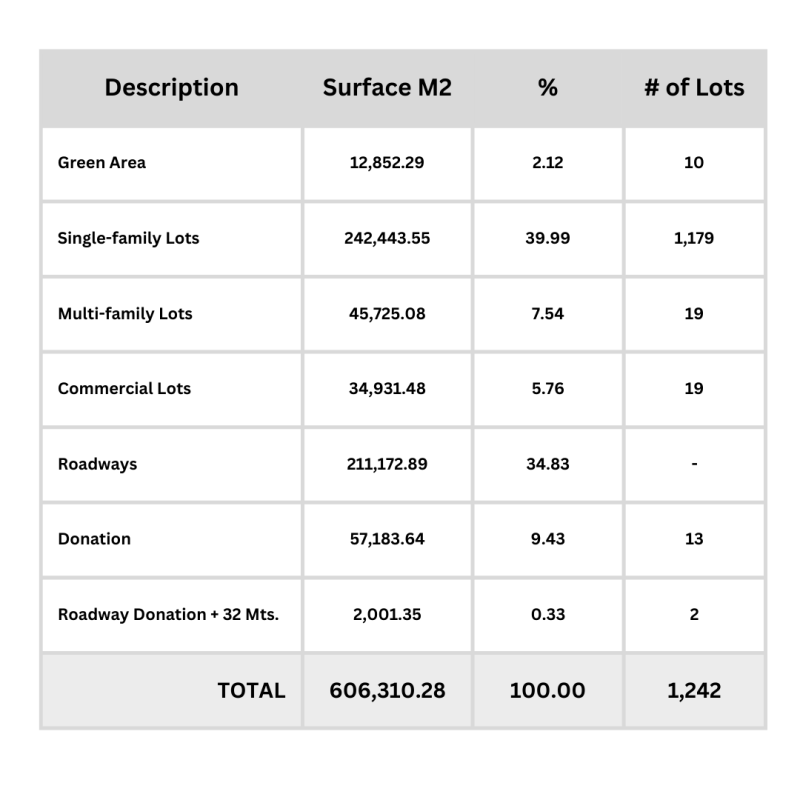 Fully urbanized single-family residential lots with underground infrastructure connected to each lot. Located within a gated community with an independent 24/7 security booth, amenities, and a central park exclusively for residents, featuring a Padel-ball court and a covered barbecue area for social gatherings